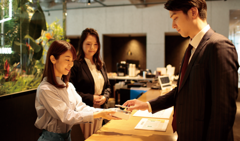 入り口のチェックイン機にて、QRコードをかざし、チェックイン。